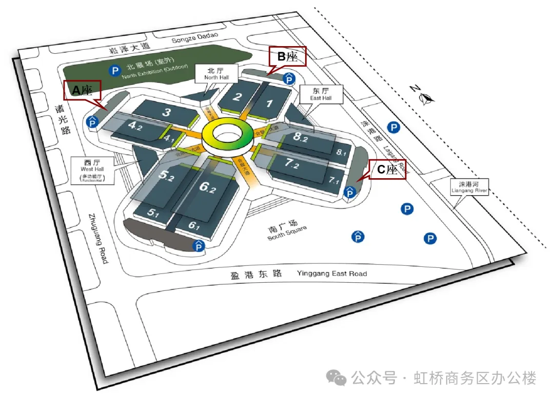 坐拥“世界级会展窗口”的国展中心,地处上海2号线终点站徐泾东站正上盖,由我国商务部和上海市政府合作共建,每年接待数以百万计的国内外各行各样的从业者参展。国展中心的建筑设计以“四叶草”为造型,每片叶子靠近最外面的扇形部分,是ABC栋三栋甲级办公楼及D栋五星级洲际大酒店所在位置。