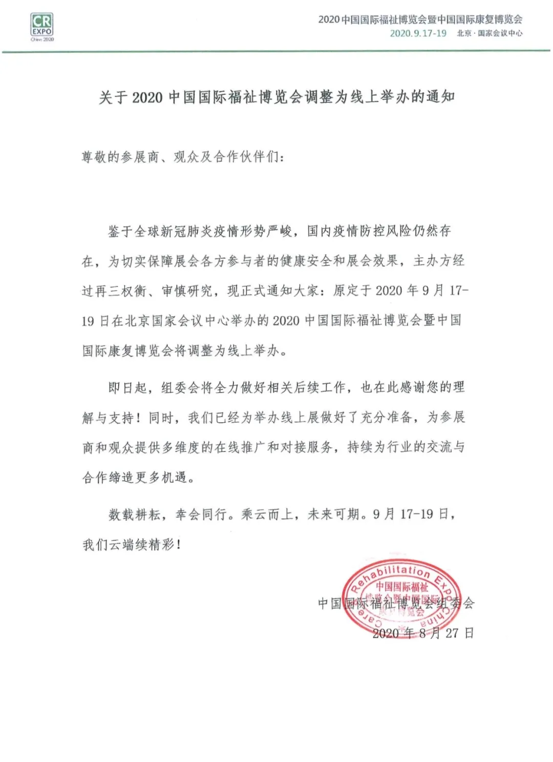 关于2020中国国际福祉博览会调整为