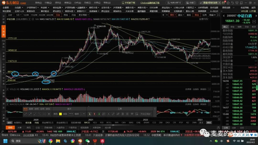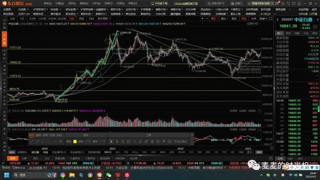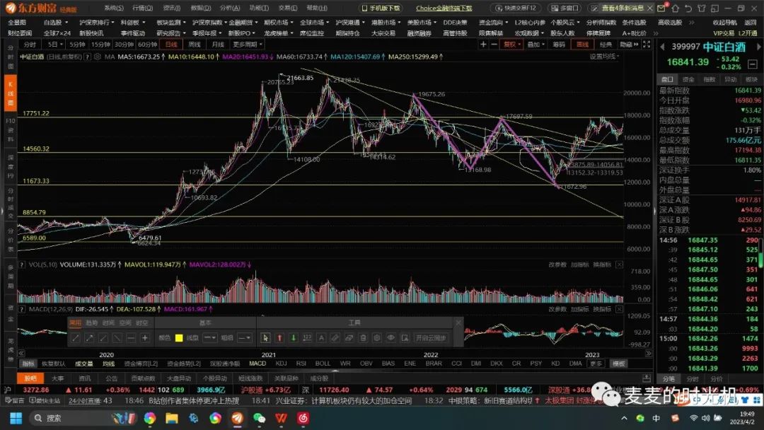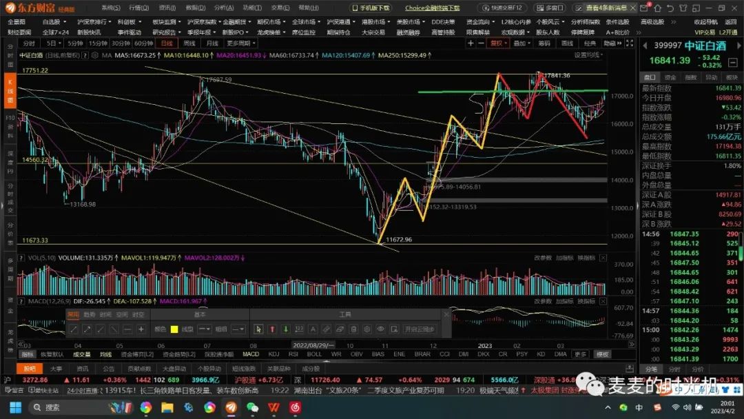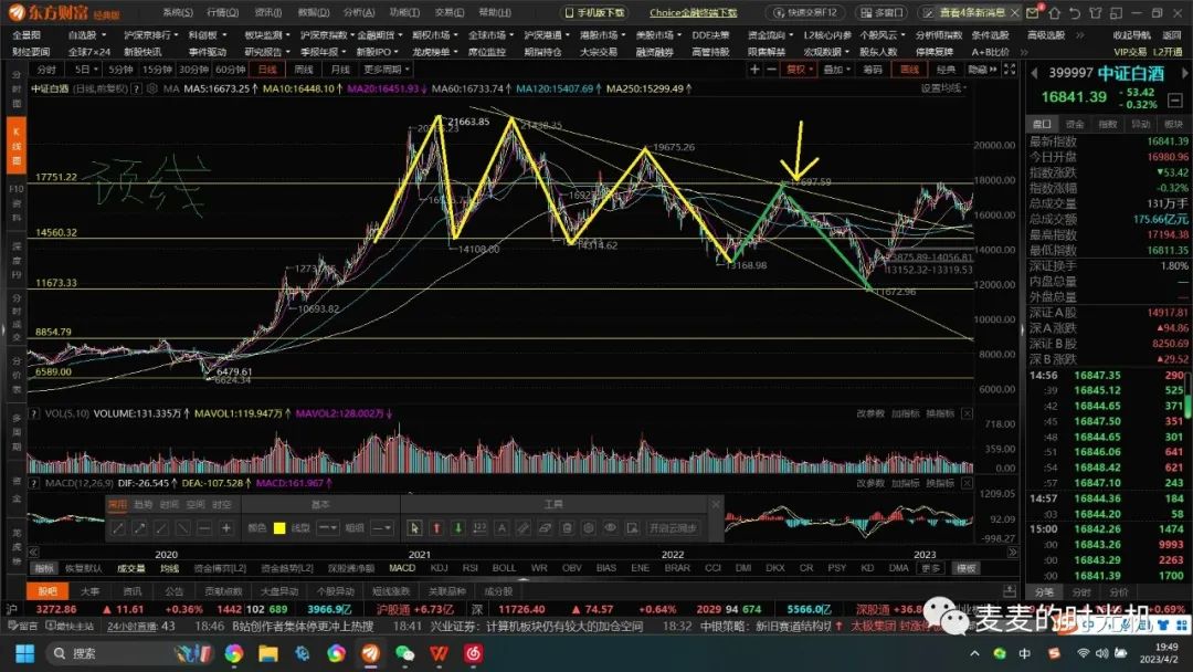 5浪上涨结构又又又形成大M头结构,预示着上涨到顶,回调形成结构,绿色为颈线,如果突破颈线就看能不能放量突破17713的三重顶(我觉得想屁吃),现在2023.3.31就已经在颈线下放出长上影线,我觉得就是往下走大C浪,so现在按现在形态分析并不是短线买入白酒的时机(非推荐不要听我瞎说,我只是自言自语,不是投资建议,,,当然长线昨天我的看法就是不买)