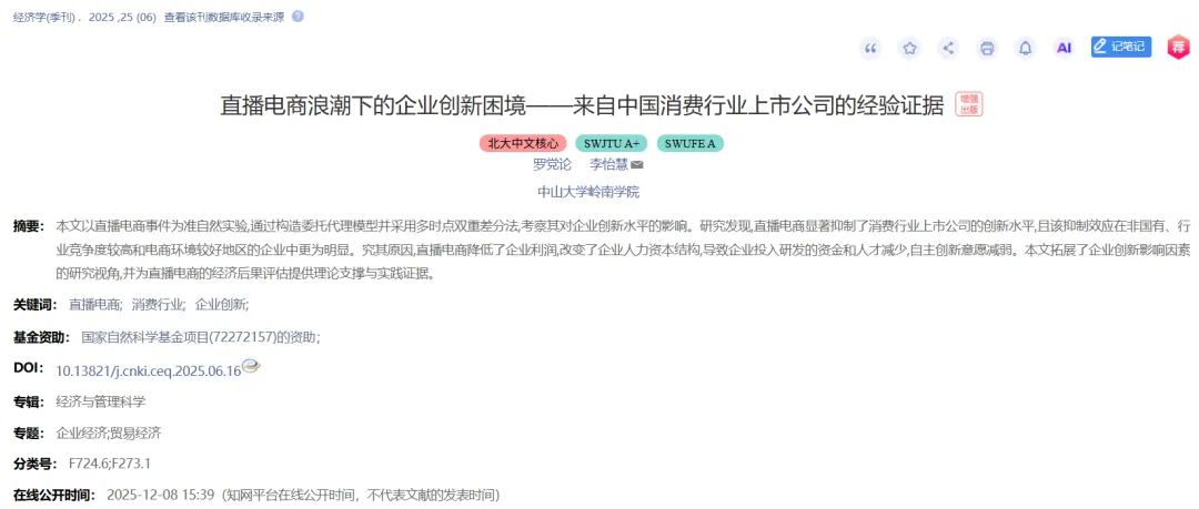 罗党论,李怡慧.直播电商浪潮下的企业创新困境——来自中国消费行业上市公司的经验证据[J].经济学(季刊),2025,25(06):1679-1697.