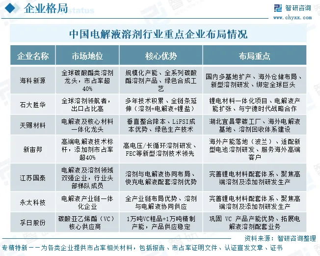 中国电解液溶剂行业呈现头部集中、国内龙头主导全球市场的竞争格局,海科新源、石大胜华等核心企业凭借技术壁垒、规模化产能与深度客户绑定占据主导地位,同时通过技术迭代、一体化布局及全球化扩张巩固优势。海科新源以超40%的全球市占率成为碳酸酯类溶剂龙头,产品供应特斯拉、宁德时代等全球巨头,布局双技术路线并研发新型溶剂,还通过长期供货协议锁定未来产能;石大胜华拥有71.6万吨/年溶剂产能且满产满销,过半产品出口高端市场,同时推进“溶剂+电解液”一体化转型,电解液出货量快速增长;新宙邦、天赐材料等企业则依托电解液业务优势,通过垂直整合布局溶剂生产,聚焦高端功能性产品,海外基地建设同步带动溶剂配套供应,行业整体形成“技术+产能+客户+全球化”的多维竞争态势。