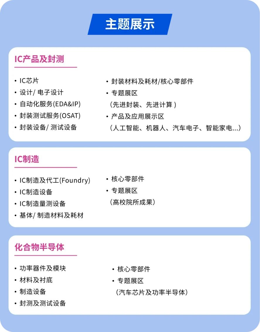 通过开幕式暨高峰论坛、4场专题峰会及N场创新技术论坛,融合高端研讨、技术交流、项目对接、资本联姻等多元形式,实现全维度展示与交流。将精准吸引国内外顶尖技术、产业资本与专业人才集聚,为集成电路产业资源整合与创新协作注入强劲动力。高规格行业峰会:重点涵盖集成电路产品与应用创新、国际先进光刻技术(IWAPS)、光电融合等行业大会。会议聚焦半导体产业链核心环节的技术突破、未来趋势与跨界创新,为行业搭建起高端的技术交流与产业对接平台。特色论坛:涵盖集成电路创新投资(同期路演)、全球集成电路产业分析师大会等。投资大会汇聚投资机构与半导体企业,探讨半导体产业的投资热点与合作机遇,促进资本与产业的深度融合;分析师大会汇聚全球顶尖智库、行业领袖与产业链精英,为与会者提供从趋势洞察到商业落地的全价值链赋能。产业创新与跨界应用论坛:涵盖先进计算、架构创新、先进存储器、先进封装、RISC-V生态等前沿技术论坛;具身智能与机器人、自动驾驶、移动通信、智慧家电等跨界应用论坛;半导体制造、封测、装备、材料、零部件等产业链协同创新论坛,为与会者带来全方位的深入洞察,促进全产业链上下游、产学研用深度合作对接。大赛/ 颁奖、供需对接等同期活动:包括复微杯、AI赋能大赛及颁奖等环节,进一步加强挖掘产业技术重大创新突破,推动技术创新与资本融合对接落地。同期也将组织召开供需对接、产品发布等更多精彩活动。过往展会铸就的成绩成为我们持续突破的强劲动力。凭借卓越的行业影响力,上届展会成功吸引1062家企业参展,集结半导体全产业链核心力量,全面覆盖芯片设计、制造、封测、材料、设备等关键领域。行业龙头企业齐聚如芯片设计领域,紫光展锐、中兴微电子、北京君正、兆芯、国芯科技、紫光同创、武汉新芯、芯汉图、大普技术、海康存储、华微科技、华大九天、芯原股份、硅芯科技等龙头企业齐聚;晶圆制造与封装测试领域,华虹半导体、通富微电、华进半导体等携特色工艺与创新技术亮相;设备领域汇聚北方华创、中微半导体、盛美上海、华海清科、拓荆科技、芯源微、京仪装备、中科飞测、苏州天准等领军企业;材料领域则有沪硅产业、江丰电子、安集科技、上海新阳、中船特气、南大光电等实力企业参展。同时,展会亦吸引众多权威科研机构与产业联盟深度参与,包括季华实验室、示范性微电子学院产学融合发展联盟、集成电路材料创新联合体、中国汽车芯片产业创新战略联盟、国家第三代半导体技术创新中心(深圳)等,全方位彰显国内半导体产业生态的完备布局。从“半导体”到“集成电路”,变的是领域拓宽与深度延展,不变的是服务产业、推动创新的初心。2026IICIE国际集成电路创新博览会愿成为全球集成电路产业协同发展的纽带与沃土,携手各界同仁,共筑产业繁荣新未来。招展工作已全面启动,诚挚邀请您携手共进!邮箱:ada.wang.cn@informa.com关于SIW