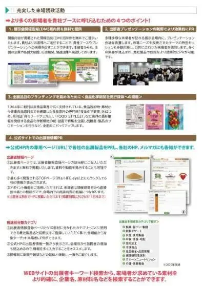 为了进一步扩大展会的影响力,主办方将与多个行业组织合作,通过会员企业的渠道进行广泛的宣传推广。此外,主办方还将通过专业媒体如《食品化学新闻》等进行深度报道,并邀请多家知名媒体进行采访报道。这些措施旨在提升展会的品牌知名度,并吸引更多潜在观众。