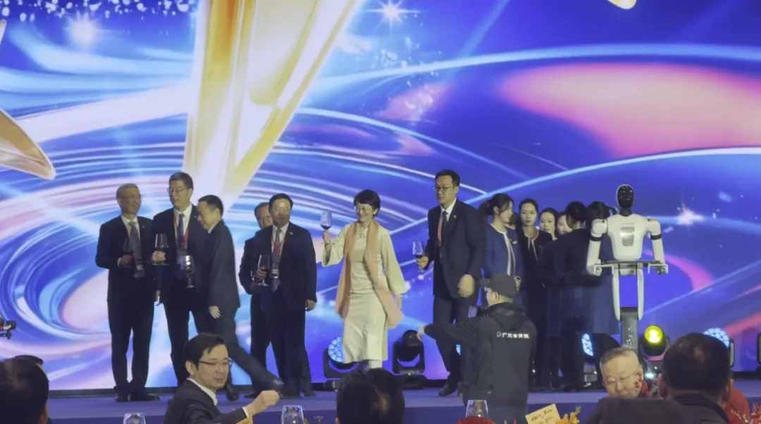 而在晚宴的端酒环节,另一台小智S2机器人则大显身手。它稳稳地端着酒杯,穿梭于舞台与领导席之间,将酒杯精准无误地送到各位领导面前。随后,在领导们举杯共饮时,小智S2机器人还与领导们一同合影留念,记录下这一美好而难忘的时刻。这一场景不仅展现了科技与人文的完美融合,更体现了智动未来机器人在高端服务场景中的卓越应用能力。