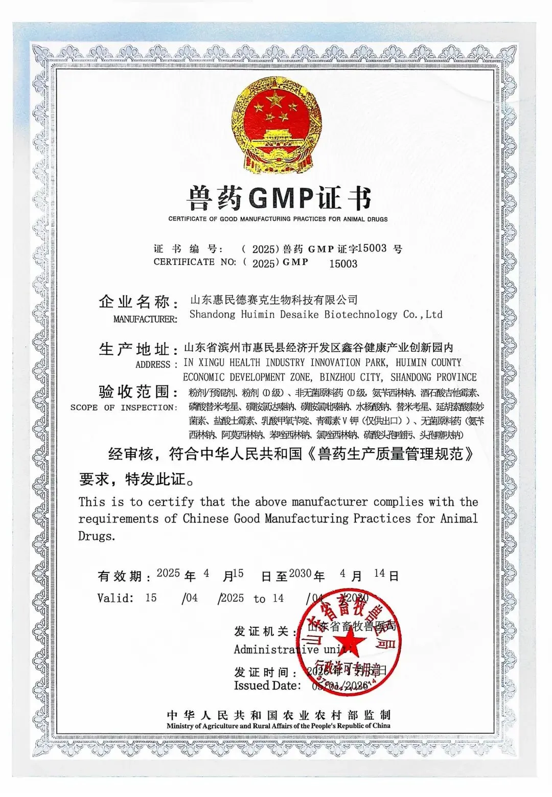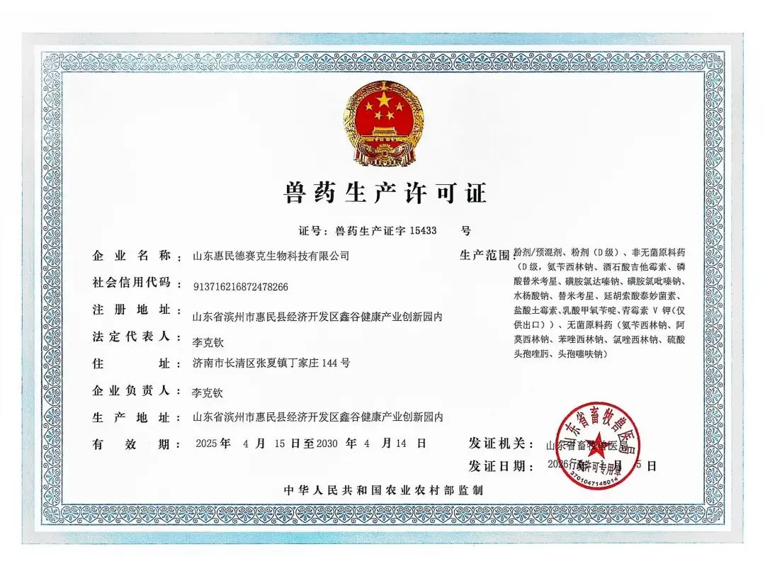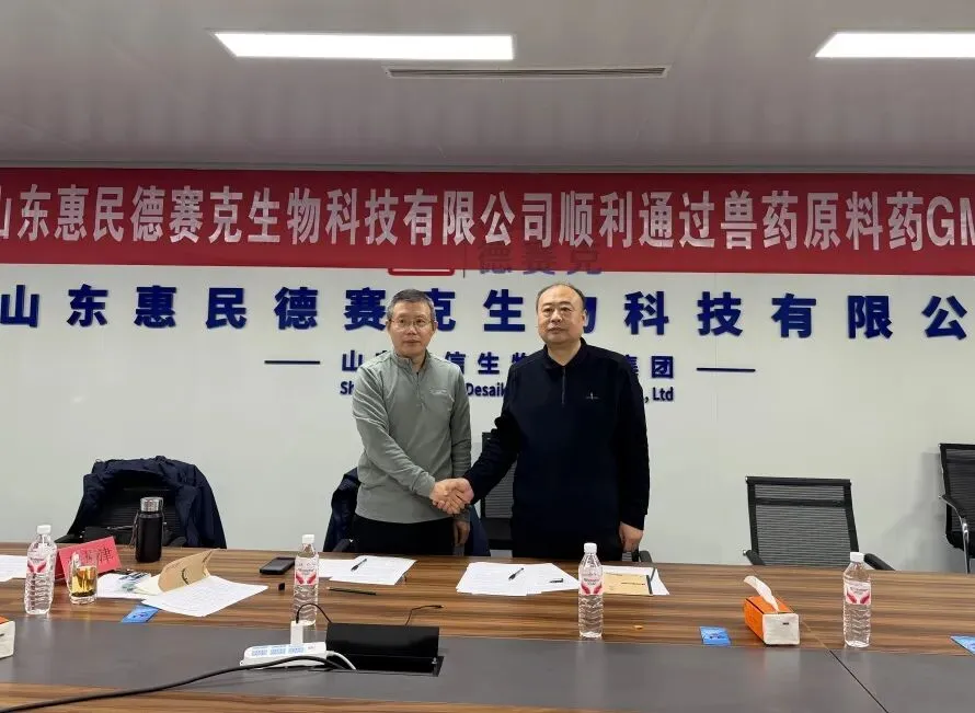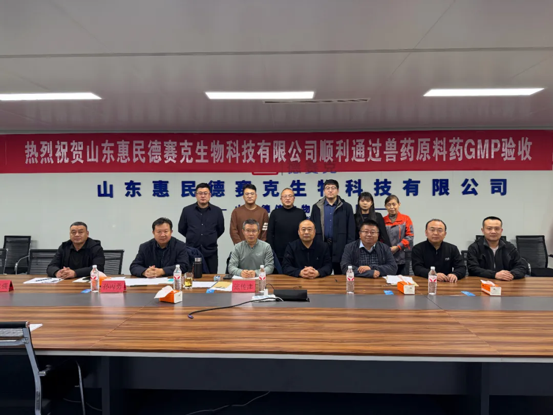 2025年12月18-19日,由山东省畜牧兽医局、滨州市畜牧兽医局组成的GMP专家检查组对山东惠民德赛克生物科技有限公司【无菌原料药(硫酸头孢喹肟、头孢噻呋钠)、非无菌原料药(D级,酒石酸吉他霉素、磷酸替米考星、磺胺氯达嗪钠、磺胺氯吡嗪钠、水杨酸钠、替米考星、延胡索酸泰妙菌素、盐酸土霉素、乳酸甲氧苄啶)】(原址改扩建)进行兽药GMP(新版)现场检查验收,滨州市畜牧兽医管理中心,惠民县畜牧兽医局等相关领导莅临陪同指导。