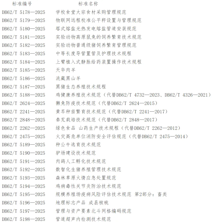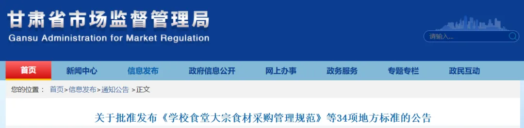 根据《中华人民共和国标准化法》有关规定,甘肃省市场监督管理局批准发布《学校食堂大宗食材采购管理规范》等34项地方标准,现予以公布。