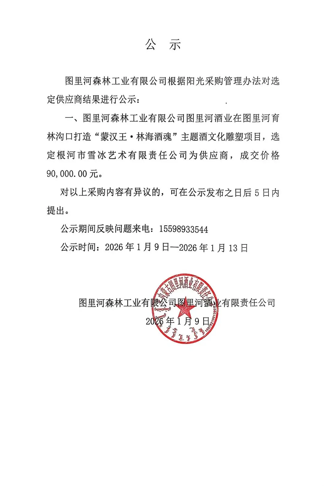 图里河森林工业有限公司根据阳光采购管理办法对选定供应商结果公示
