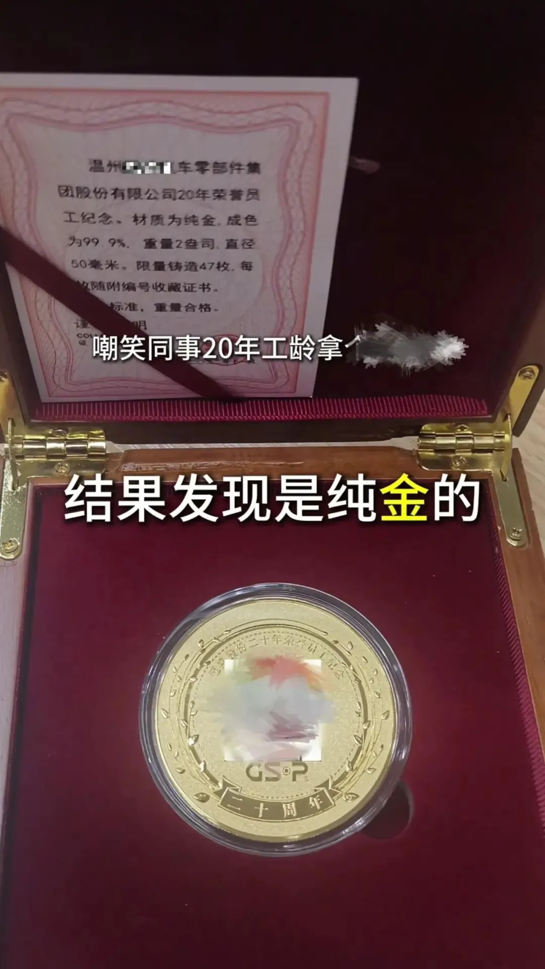 8日,视频发布者告诉记者,他来自温州市冠盛汽车零部件集团股份有限公司,工龄达到20年的员工都会收到奖牌。该公司一名工作人员也告诉记者,这是公司的传统,每位工龄满20年的员工都会在年会时收到这块奖牌,重量通常都是2盎司不变。她所在的部门也有同事收到过,今年公司有几十人收到。