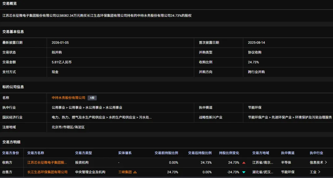 长江环保集团于2026年1月5日与江苏芯长征微电子集团股份有限公司(简称“芯长征”)签署了附条件生效的《股份转让协议》,长江环保集团拟向芯长征协议转让其所持中持股份24.73%股份。