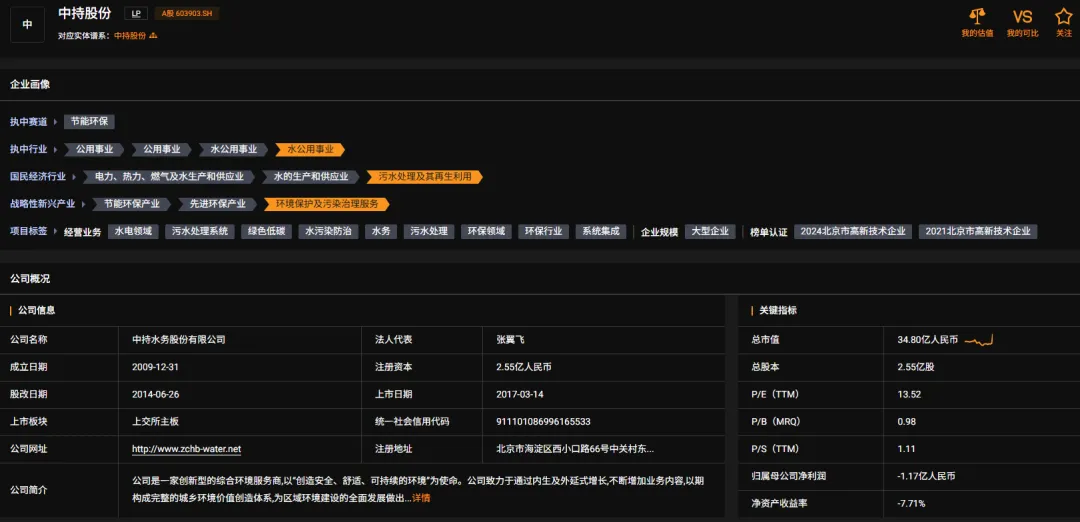 中持股份主营业务为城镇污水处理、工业园区及工业污水处理、综合环境治理,主要产品为环保基础设施建造服务、运营服务、技术产品销售与技术服务。