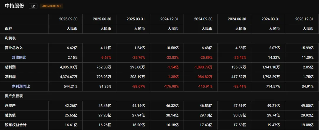 截至2025年9月末,中持股份货币资金3.15亿元,净资产16.61亿元。