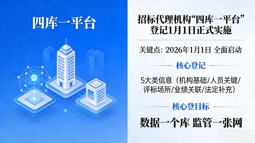 2026年1月1日,《工程建设项目招标代理机构管理暂行办法》正式落地,招标代理机构全面启动住建部门“四库一平台”信息登记工作,标志着工程建设招标投标市场迈入“数据一个库、监管一张网”的规范化发展新阶段。