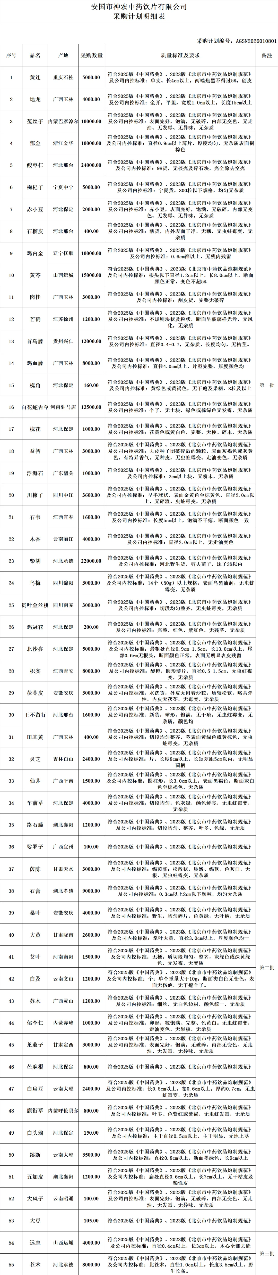 安国市神农中药饮片有限公司计划采购55个品种:黄连、地龙、菟丝子、郁金、酸枣仁、枸杞子、赤小豆、石榴皮、鸡内金、黄芩、肉桂、芒硝、首乌藤、鸡血藤、槐角、白花蛇舌草、槐花、益智、浮海石、川楝子、石韦、木香、柴胡、乌梅、贯叶金丝桃、鸡冠花、北沙参、枳实、茯苓皮、王不留行、田基黄、灵芝、仙茅、车前草、络石藤、娑罗子、茵陈、石膏、桑叶、大黄、艾叶、白及、苏木、郁李仁、莱菔子、苎麻根、白扁豆、鹿衔草、白头翁、续断、五加皮、大风子、大豆、远志、苍术