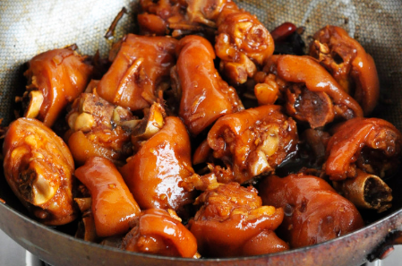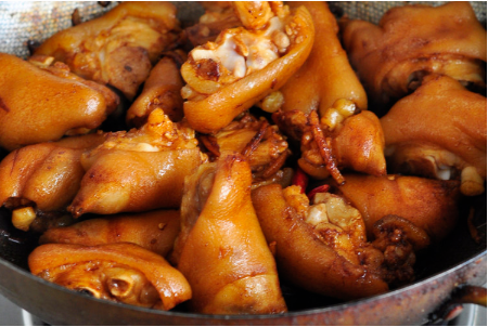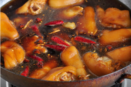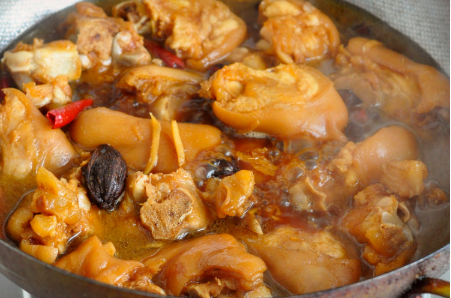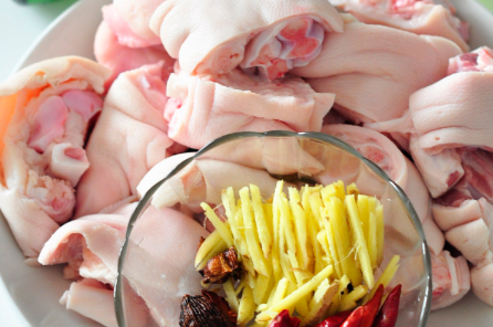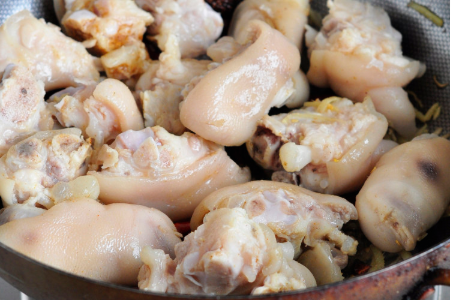 4、放入猪蹄,一边翻炒一边晃动锅,到猪蹄不粘锅并且外皮微黄。