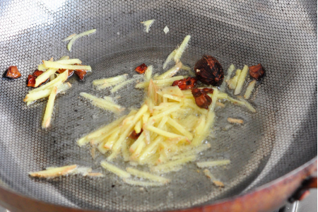 3、锅里放油,小火煸炒姜丝,八角,草果,姜丝微黄为好。
