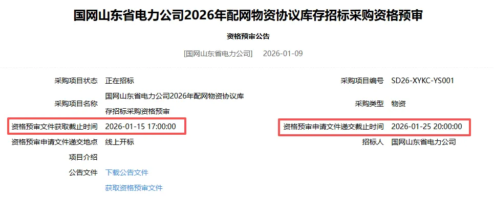 1.2国网山东省电力公司2026年配网物资协议库存招标采购的相关品类采用资格预审方式进行,本次预审结果有效期为预审结果发布之日起至2026年12月31日。在此期间,国网山东省电力公司2026年配网物资协议库存招标采购相应物资类别仅接受资格预审合格的申请人参加投标。在此,特邀请有意愿的潜在申请人(以下简称申请人)提出资格预审申请。