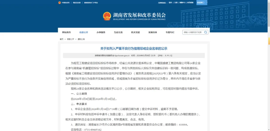 2026年1月8日,湖南省发改委公示:24家企业在“机器管招投标”项目投标中,因投标文件创建标识码一致被认定串标。依据相关规定,拟被记招投标信用零分,两年内禁止参与湖南依法必须招标项目投标。