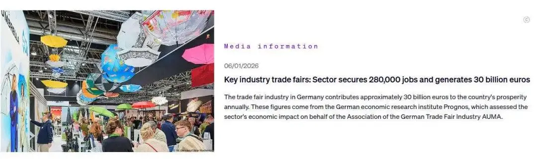 顶级展会聚集地:全球 三分之二 的顶级行业展会在德国举办。 覆盖核心产业:涵盖机械制造、汽车、电子科技、医疗健康等德国优势产业。 标志性展会范例: 这些展会已成为 行业创新风向标 与 企业全球拓展的战略平台。