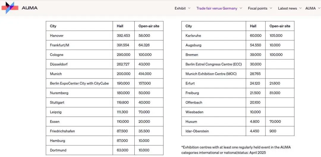 基础设施:拥有 70余个 现代化展览中心,总展览面积超 300万平方米。 顶尖展馆:汉诺威、法兰克福、杜塞尔多夫等展馆均位列 全球十大展馆。 服务能力:不仅硬件先进,更配备国际化专业团队,提供 一站式解决方案。
