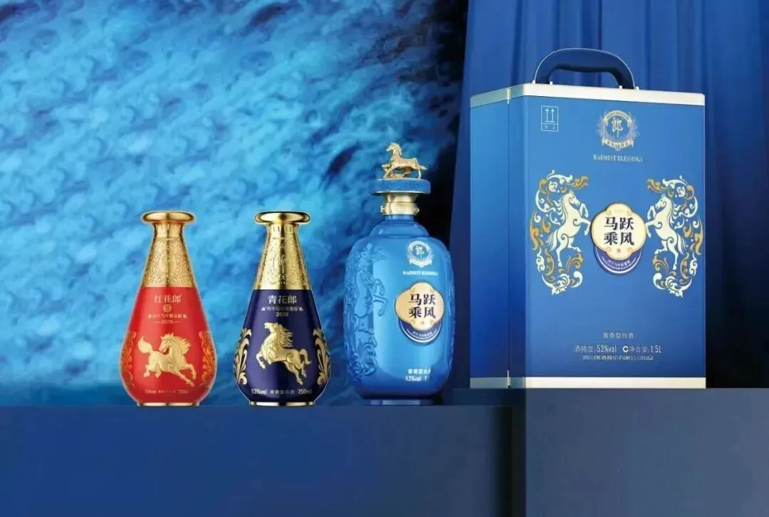 推出三款马年产品,以新锐蓝色为主,青花郎取吉意,红花郎寓红火,满足多元需求。“马跃乘风”丙午马年限量版以新锐蓝色为主调,寓意“奋进通达,前程万里”,郎酒将其定义为“高端奢香藏品系列的小批量勾调、限量典藏之作”;“青花郎·丙午马年限量版”则 取意“金马玉堂”吉意,融入汗血宝马踏云衔芝的祥瑞意象,传递“一马当先铸大业”的进取精神;“红花郎15·丙午马年限量版”采用水滴瓶型,轮廓圆融而富有张力,瓶身鎏金骏马图腾栩栩如生,主色调以炽烈中国红营造节日氛围,寓意“红红火火”。