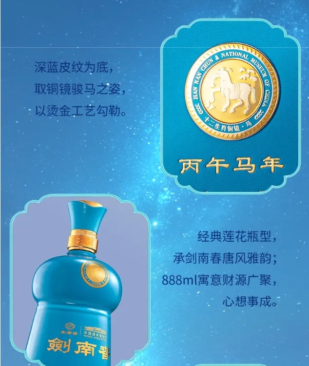 推出马年生肖酒,酒瓶采用蓝紫色,融五行文化与生肖文化于一体,瓶身有光刻材料,有酒茶两用器具,契合年轻消费者对国潮的期待。瓶色选用蓝紫色,对应五行中的“火”,寓意紫气东来,其最突出的特点是科技感——瓶身采用光刻材料,光影流转间绽放绚丽色彩,酒具取“马蹄杯”型设计,延续“春风得意马蹄疾”的古典文化意蕴,让传统与现代产品经典碰撞。