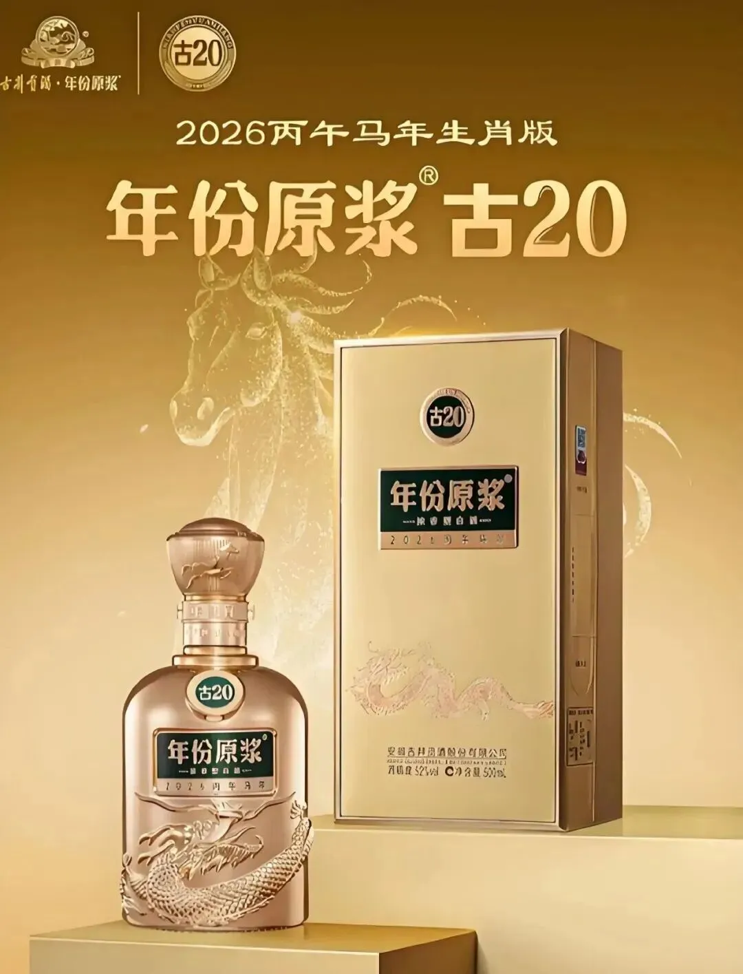 年份原浆古20马年生肖酒瓶身沿用年份原浆经典的盘龙玉玺器型,以“流光金”为主色调,灵感源自汗血宝马的耀眼色彩,暗藏着“承流光而行,终跃金门”的美好期许,瓶盖以多面切割结构雕琢出骏马扬蹄的瞬间轮廓,寓意事业腾达;瓶身铭牌则以一抹云杉绿点睛,演绎运势之蓬勃不息。以名酒臻品、东方美学和稀缺价值多重叠加,满足消费者品饮、宴请、礼赠、典藏等多种需求。采用一瓶一证一编号。
