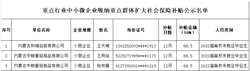 关于磴口县重点行业中小微企业吸纳重点群体扩大社会保险补贴公示名单