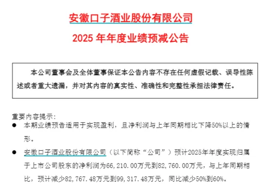 作为白酒上市企业中首家交出成绩单的品牌,口子窖2025年业绩让不少业内人士倒吸一口凉气。今年口子窖预计全年归母净利润6.62亿元至8.28亿元,同比大降50%到60%,创下近年来最大跌幅。