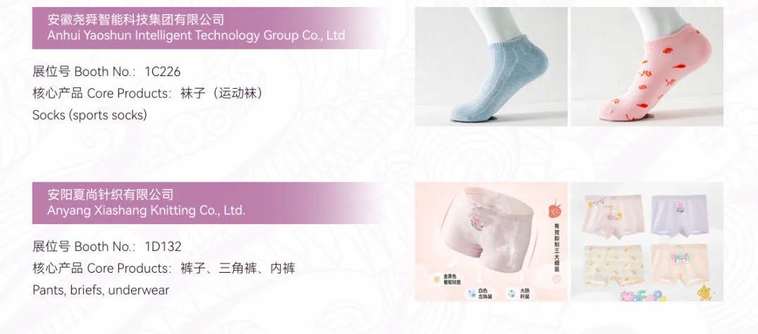 成品袜展区:展示各类户外运动、潮流少女、商务休闲等市场细分赛道的最新款棉袜、丝袜、袜裤等成品袜。