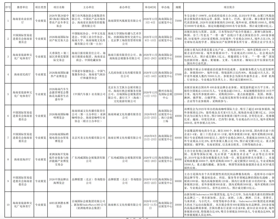 10个专业展览为2026年第29届中国(海南)国际热带农产品冬季交易会、2026海南国际知识产权交易大会、天香国色·第三届沉香黄花梨国际交易会、2026海南国际康养产业博览会、2026海南汽车生态露营博览会暨海花岛露营生活嘉年华、2026海南国际咖啡博览会、2026海南国际跨境电商自由贸易博览会、亚洲深海开发海底作业装备与海洋能源产业博览交易会、2026中国品牌出海博览会、ADEX亚洲潜水博览会。