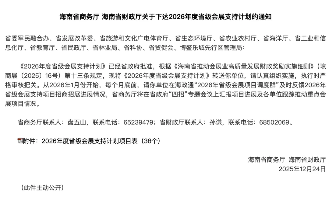 据海南省商务厅网站消息,《2026年度省级会展支持计划》已经省政府批准。今年海南将支持38个省级会展项目举办,其中专业展览10个、专业会议28个,举办地点包括海口、三亚、琼海、儋州、文昌等地。