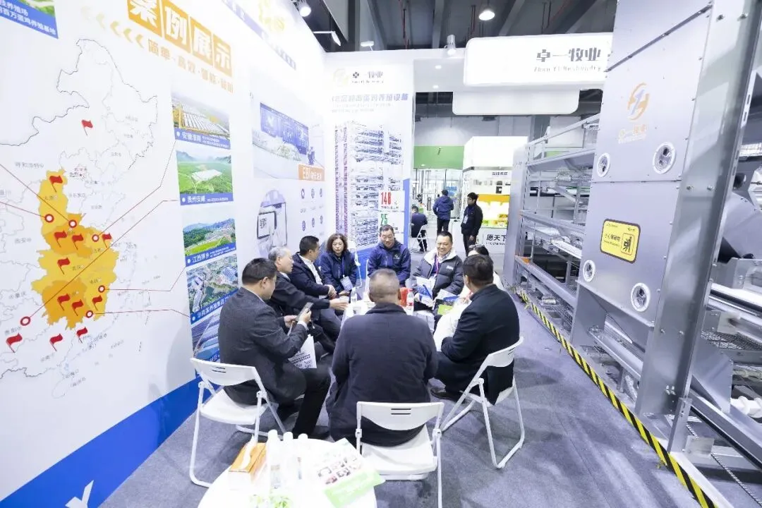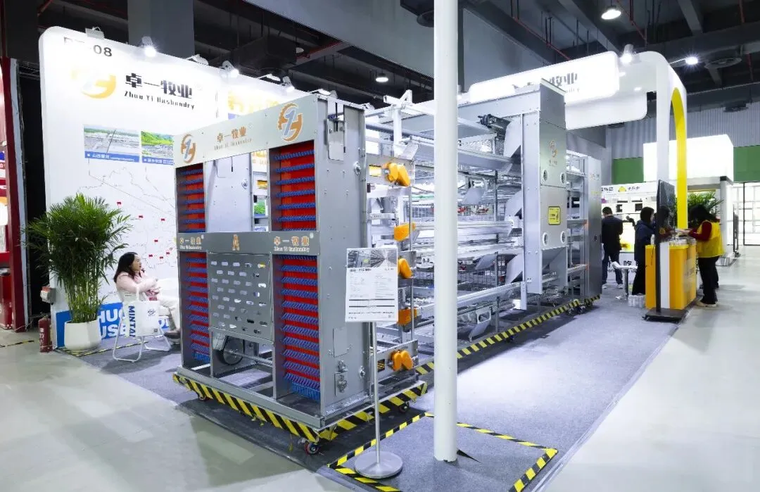 展位上,卓一牧业自研的12层超高蛋鸡养殖设备凭借养殖规模大、占地面积少、用工成本低、管理便捷等特点,吸引众多观众。