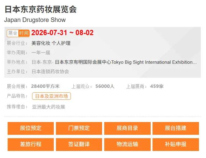 [展位预定、门票预定、展商目录、展台搭建、差旅行程、签证、翻译、物流运输、补贴申报]
