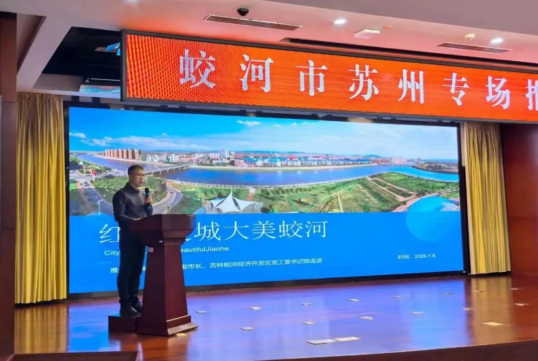 2026年1月8日上午,“蛟农臻品·苏韵同行”蛟河市苏州专场推介会在苏州市轨道交通大厦成功举办。蛟河市委副书记、市长王威,吉林市商务局副局长车永光,蛟河市副市长、蛟河经济开发区党工委书记陈连波等家乡领导参加了本次活动。苏州市辽宁商会副会长都文、理事栾丽娟、会员冀振华参加会议。