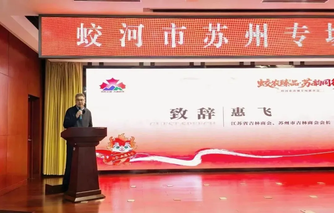 江苏省吉林商会会长惠飞在发言中深情回顾了2025年商会与蛟河的两次重要互动:家乡领导赴苏考察,以及商会组织20余位江苏企业家回蛟河走访。他表示,商会将持续发挥纽带作用,积极推介蛟河产业与政策,引导更多企业家走进蛟河、投资蛟河,全力支持“蛟农臻品”开拓江南市场,并推动在石材、医药、新能源等领域的务实合作。