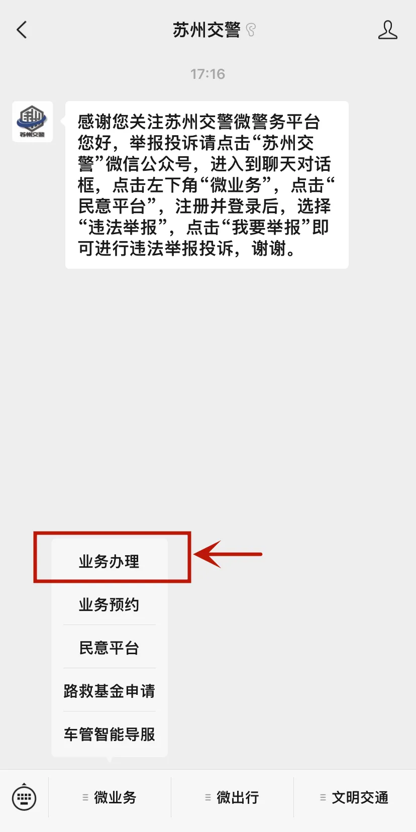 1.关注苏州交警-点击业务办理