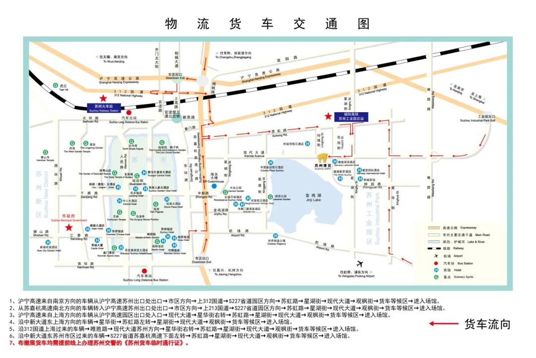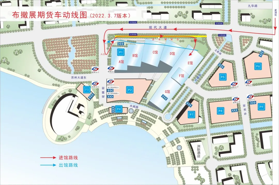 3.布展车辆线路:苏虹路—华池街—苏州大道—观枫街—西门—内马路等候区—一站式服务中心办理报到手续后—D/E馆卸货区东北1门进入场馆