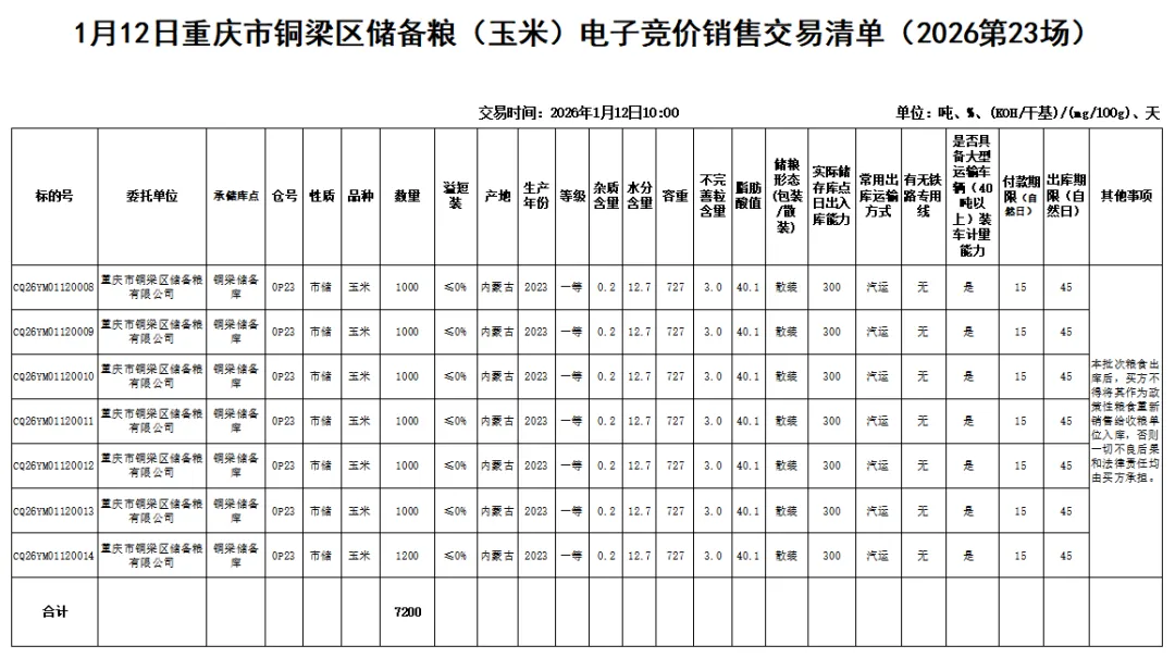 受重庆市铜梁区储备粮有限公司委托,重庆市粮油批发市场有限责任公司(即国家粮食重庆交易中心,以下简称“批发市场公司”),定于2026年1月12日10:00举办重庆市铜梁区储备粮公司(玉米)电子竞价销售交易会,现将有关事项公告如下: