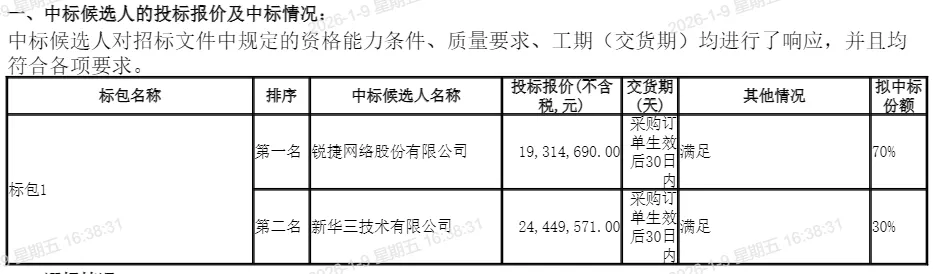 经过评审,第一中标候选人是锐捷网络,拟中标份额为70%;第二中标候选人是新华三,拟中标份额为30%。从报价来看,锐捷网络报价1931.469万元(不含税),新华三报价2444.9571万元(不含税),比锐捷网络高出500多万元。
