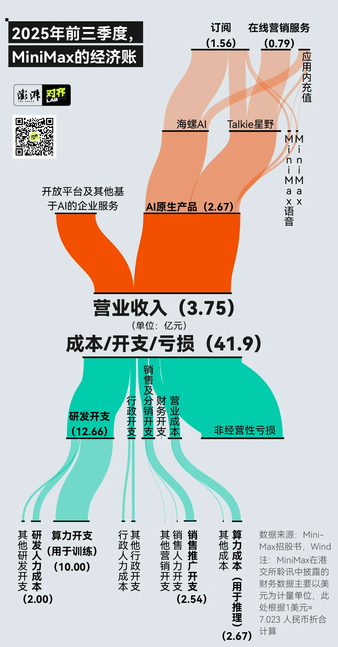 招股书显示,MiniMax 在 2025 年前三季度共赚了 3.67 亿元,对应营业成本约 2.88 亿元,毛利为 0.79 亿元。不过,在主营业务成本之外,公司还需承担训练相关的算力与人力等支出,仅研发投入一项,便达到营收规模的 337%。