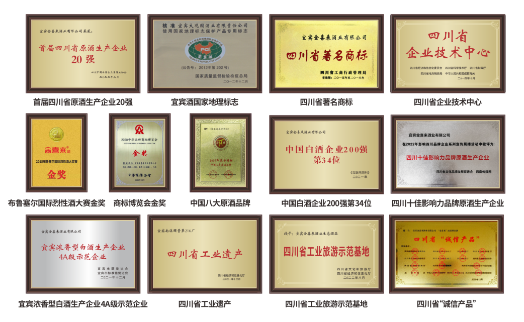 多年来的励精图治让金喜来赢得了广泛的社会关注与业界的高度评价,公司获得各级荣誉六十余项,先后荣获“四川省著名商标”“四川省企业技术中心”“中国白酒企业百强榜”“四川省工业遗产”“四川省工业旅游示范基地”“首届四川省原酒生产企业20强”等。2022年金喜来生态酒谷景区正式批准为“国家AAA级旅游景区”。