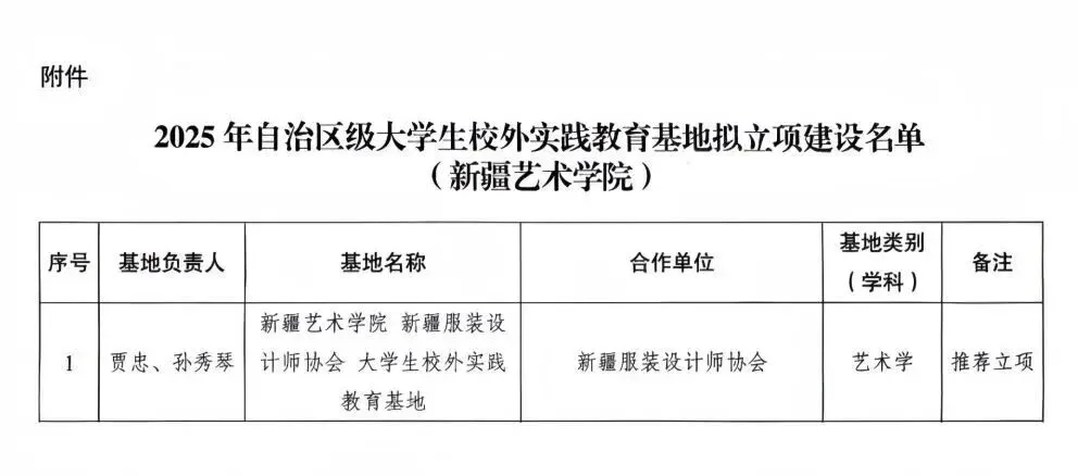 近日,新疆维吾尔自治区教育厅发布《关于反馈2025年自治区级大学生校外实践教育基地拟立项建设名单的通知》和《关于公布2025年自治区级专业特色学院等项目建设高校名单的通知》,我院申报的“新疆艺术学院 新疆服装设计师协会 大学生校外实践教育基地”(学科类别为艺术学),成功入选2025年自治区级大学生校外实践教育基地拟立项建设名单;新疆艺术学院“设计创新实践教学示范中心”入选2025年自治区级实验教学示范中心建设高校名单。