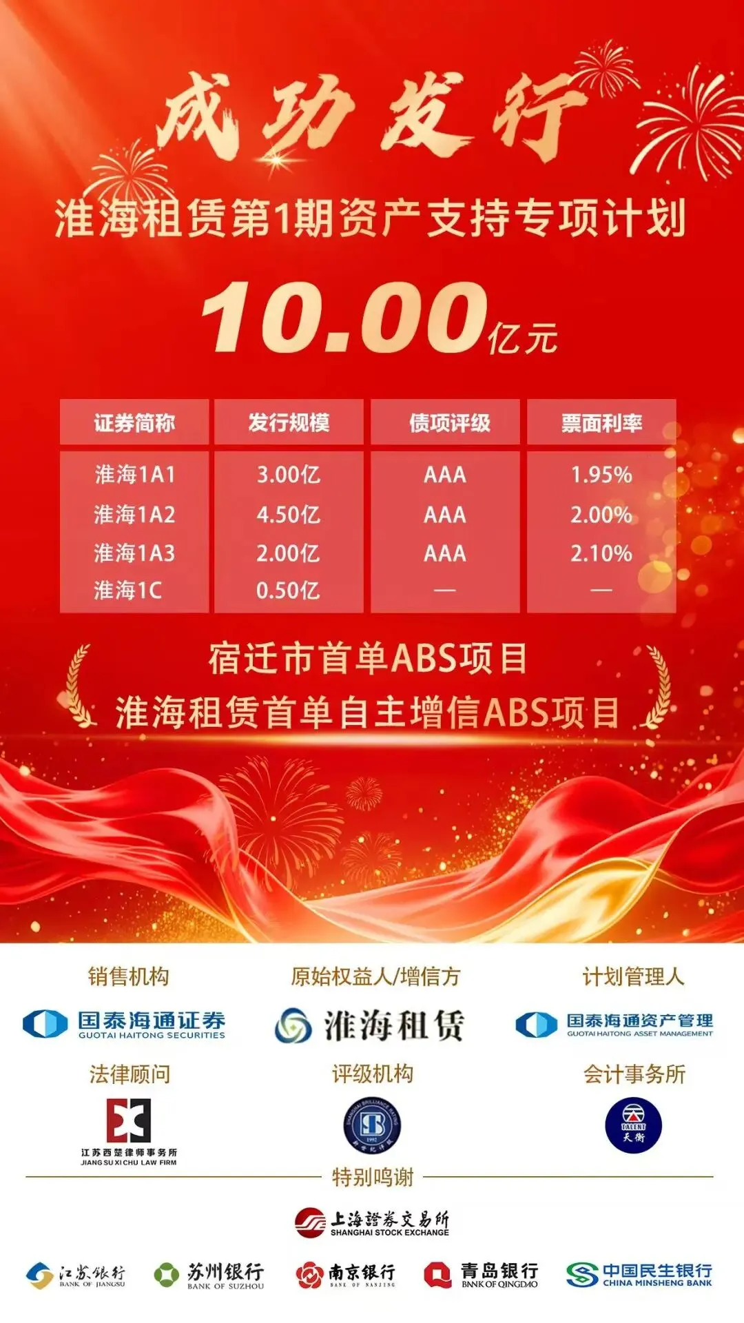 近日,市产发集团下属淮海融资租赁公司在上海证券交易所成功发行宿迁首单资产证券化产品(ABS),发行规模10亿元,无外部增信担保。