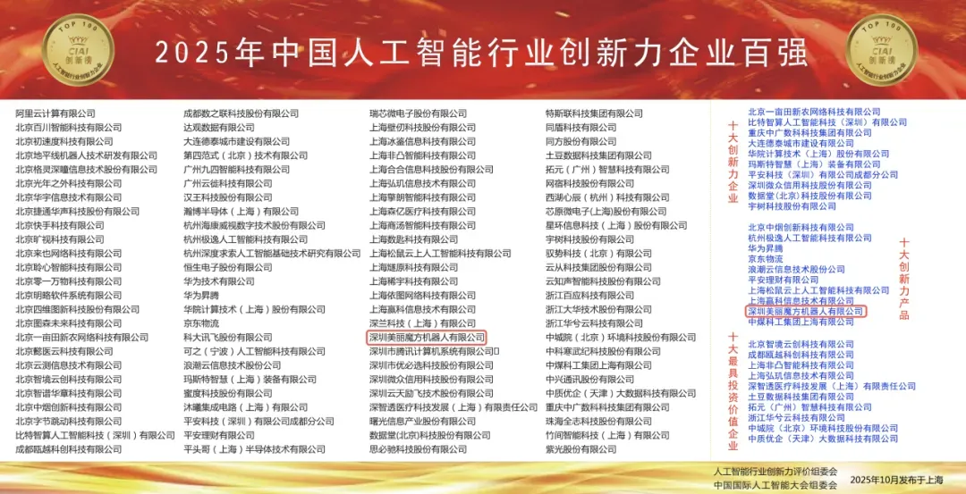 2025年10月28日,以“i时代·智创未来”为主题的第十届中国国际人工智能大会在上海隆重开幕。在这场备受业界瞩目的盛会上,美丽魔方机器人凭借其在人工智能与机器人融合领域的创新突破,成功斩获“2025年中国人工智能行业十大创新力产品奖”,并入选“2025年中国人工智能行业创新力企业百强榜”,与华为、腾讯、科大讯飞等科技巨头同台受奖。