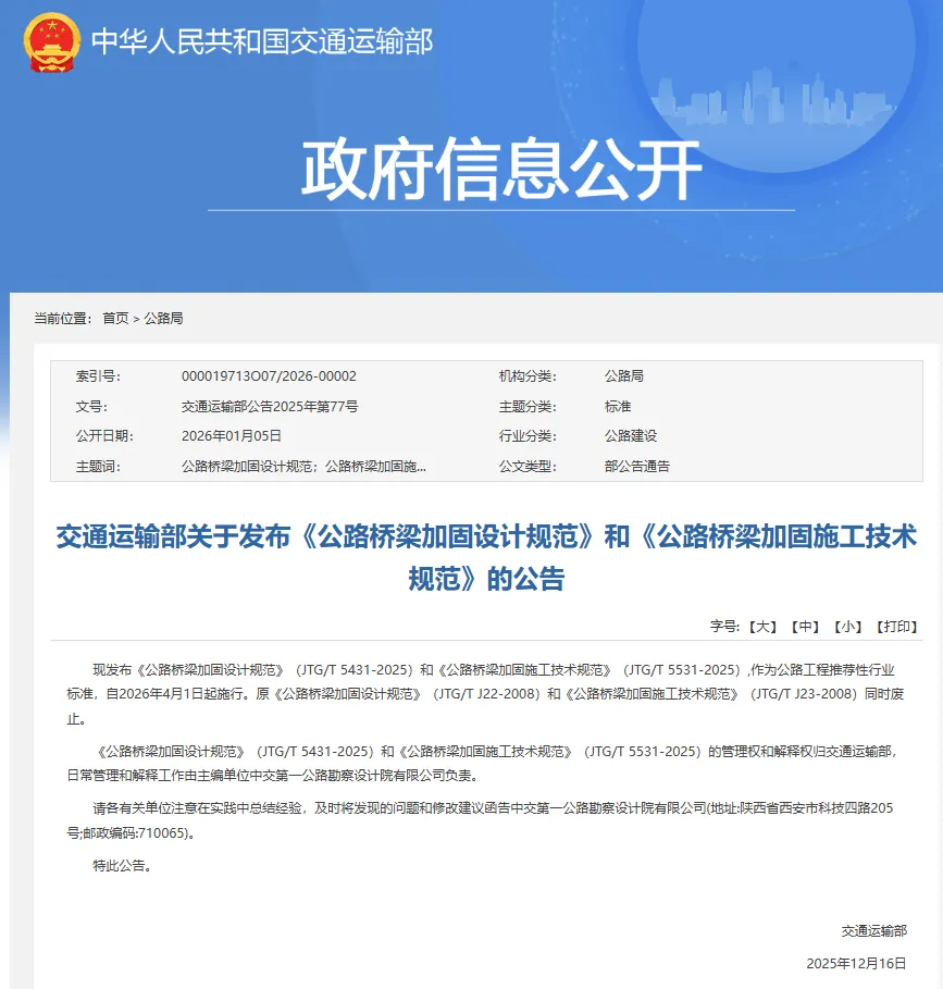 由中交设计所属一公院负责具体实施的交通运输部行业标准《公路桥梁加固设计规范》(JTG/T 5431-2025)(以下简称《设计规范》)和《公路桥梁加固施工技术规范》(JTG/T 5531-2025)(以下简称《施工技术规范》)经交通运输部批准,于2025年12月16日发布,自2026年4月1日起施行。原《公路桥梁加固设计规范》(JTG/T J22-2008)和《公路桥梁加固施工技术规范》(JTG/T J23-2008)同时废止。