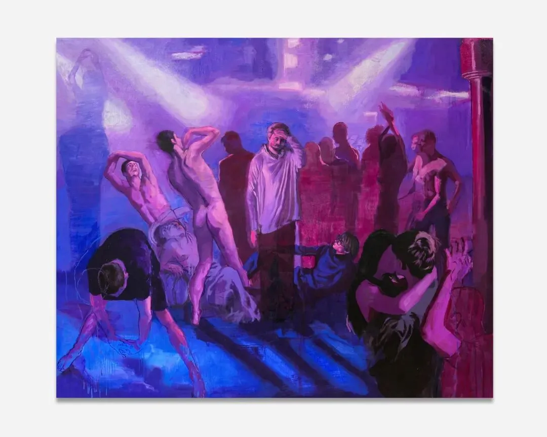 在这一系列绘画中,唐咏琪亦构建了属于自己的神话系统:多件作品共同叙述了一个从陶罐中生长出的少女,在容器破裂、坠落之际被释放回大地的故事;而另一幅描绘夜店场景的当代画面,则在灯光与欲望交织的表象之下,掩映着迷惘与孤独的情绪。