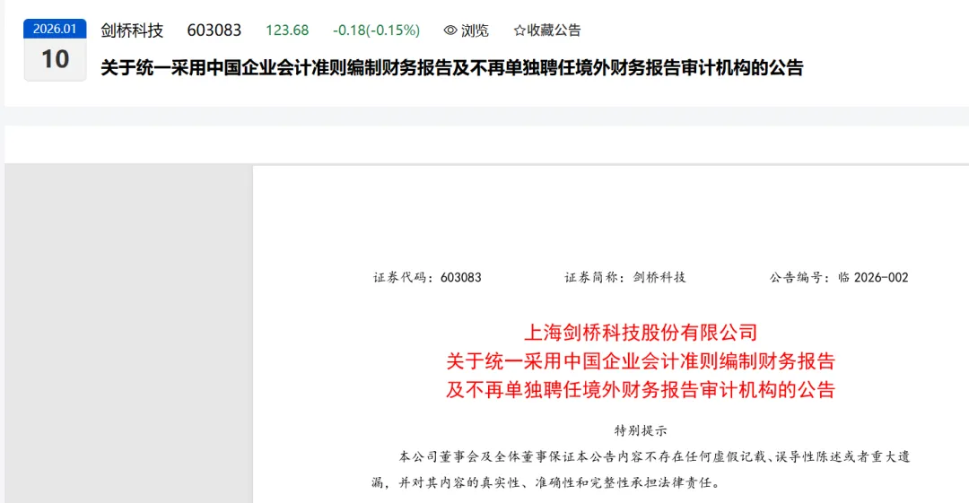 上海剑桥科技股份有限公司(以下简称 “公司”)于 2026 年 1 月 9 日分别以通讯表决方式召开第五届董事会审计委员会第十二次会议、第五届董事会第二十四次会议,审议通过了《关于公司统一采用中国企业会计准则编制财务报告及不再单独聘任境外财务报告审计机构的议案》。根据相关法律法规、《公司章程》规定,本事项无须提交公司股东会审议。现将具体情况公告如下: