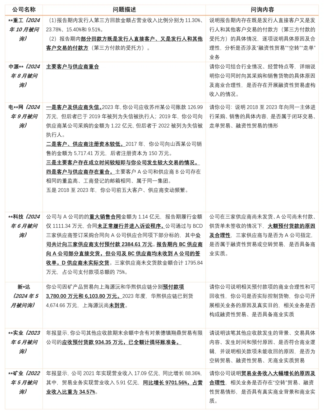 结合上述问询,如上市公司存在如下情形,容易引发证券监管机构对于上市公司涉嫌开展融资性贸易的关注: