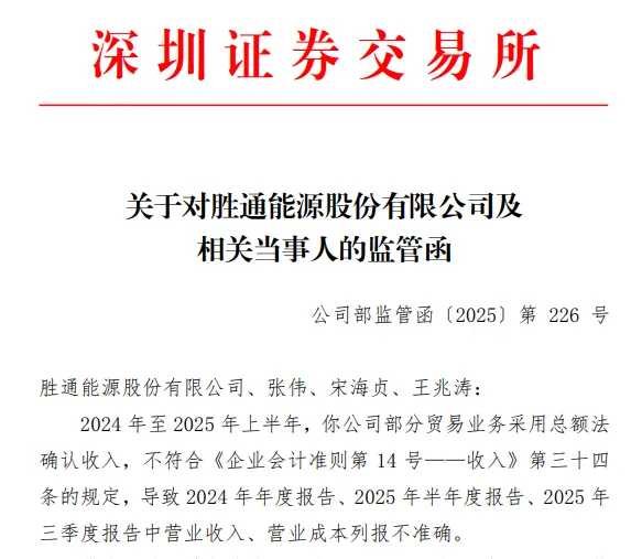 次日(12月26日)盘后,胜通能源再收深交所监管函。监管函指出,公司2024年至2025年上半年部分贸易业务采用总额法确认收入,导致多份定期报告营收、成本列报不准确,董事长张伟、财务总监宋海贞等高管因未恪尽职守被点名警示。