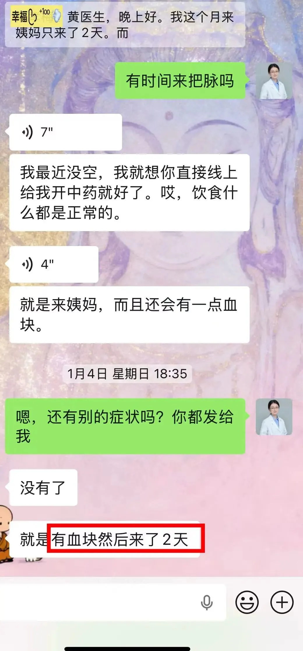 小姐姐很配合,每天按时喝中药,也试着调整心态,减少内耗。坚持喝了2周后,她反馈说睡眠明显好转了:“现在躺下20多分钟就能睡着,夜里也不怎么醒了,白天精神好多了。” 我本想让她再巩固调理一段时间,没想到没过多久,她就慌慌张张地找来了——原来是来了月经,却只来了2天就结束了,还伴有血块。